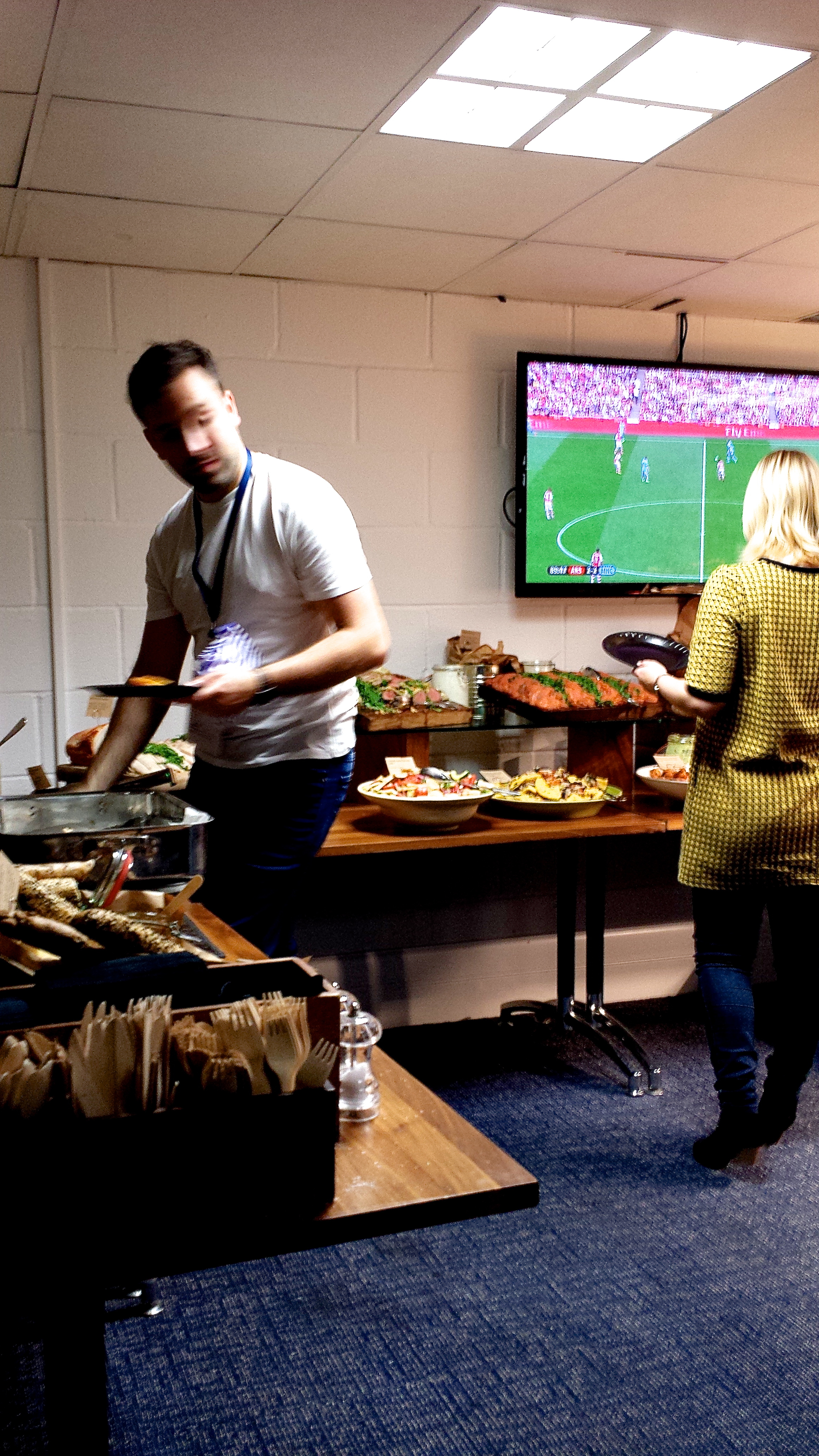 Najprej se je treba pofočkat pri Brianu, potem pa takoj tole – ok, zadaj je ena od plazem, na katerih sta se z 2:2 še mučila Arsenal in Manchester City, spredaj pa, itak, konstantna senzacija med člani press-box mafije – kosilo na Stamford Bridgeu je raj za lačne