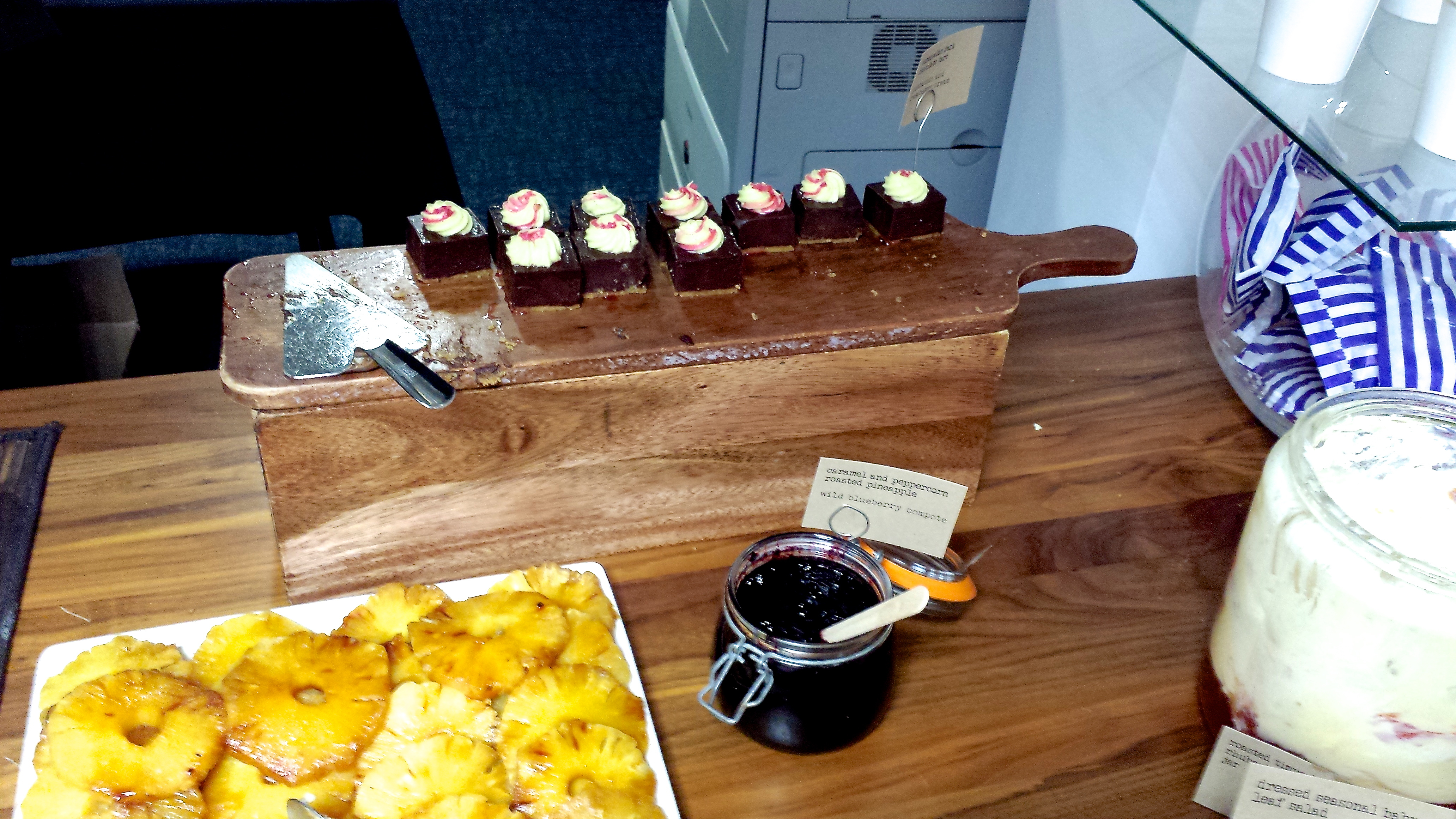 Štrukelj, v katerega so zarolani: črn riž, cvetača, skuta z brusnicami itd., čez pa rukola. In to je le ena od kakih petnajstih različnih jedi, med katerimi lahko izbiramo. Novinarji smo v gosteh pri CFC čist…..To je gostoljubje! Že vedo zakaj 😉