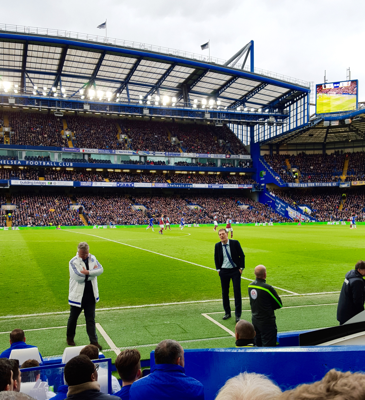 Tekmo so občutno bolj podjetno začeli gostje. Čudovit zadetek Argentinca Manuela Lanzinija, pa čeprav dosežen po požrtvovalnem posredovanju domačega vezista Johna Obija Mikela, ni bil presenečenje. Domači so le stežka lovili oster igralni ritem vrste, ki ji je, še bolj zavzeto kot ponavadi, dirigiral razpoloženi trener Slaven Bilić. Čeprav je bil Hrvat zelo razglet in zmagovalno nastrojen, je še pred odmorom večkrat prišel kakšno pripomniti tudi domačemu trenerju Guusu Hiddinku. Seveda sta se nekdanja selektorja Nizozemske in Hrvaške nasmejala in nato tudi tovariško pozdravila. Tik pred koncem prvega dela je za izenačenje s prostega strela vrhunsko zadel Cesc Fabregas.