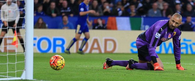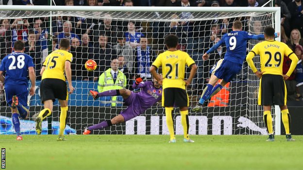 Heurelho Gomes, nekdanji golman PSV-ja in Tottenhama, znan po genialnih obrambah in tudi po famoznih zaštrikih, je v Leicesteru uprizoril obe vrsti veščin. Prvi gol za domačine je bil kompletno njegov, nato pa je domače letalce do zmage pripeljal Jamie Vardy, ki je zadel iz penala. Gomes je Vardyja pred tem s prekrškom spravil v salto in na hrbet. Brazilec je zato dobil le rumeni karton. Raiyad Mahrez je kazenski šut v izvedbo bratsko predal Vardyju, ki je tako zabil na devetih zaporednih tekmah. Če bo še na naslednji, ko Leicester igra v gosteh pri Newcastleu, bo izenačil rekord Ruuda Van Nistelrooya iz dveh povezanih sezon 2002-2003 in 2003-2004. Go Vardy!
