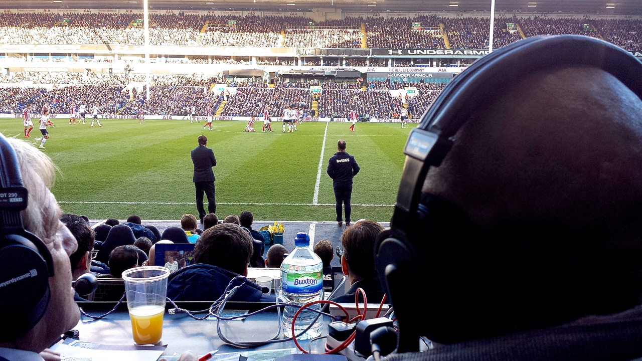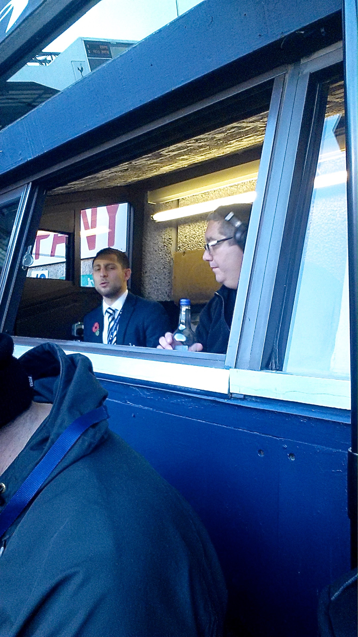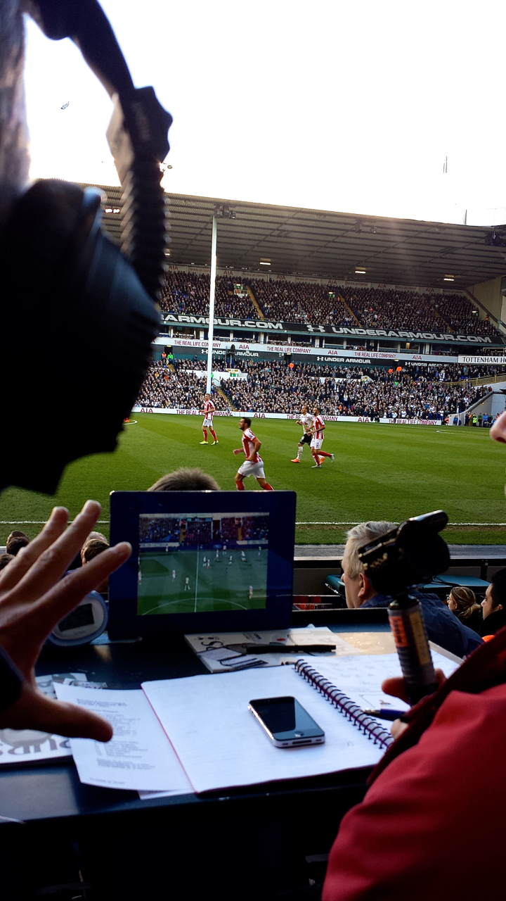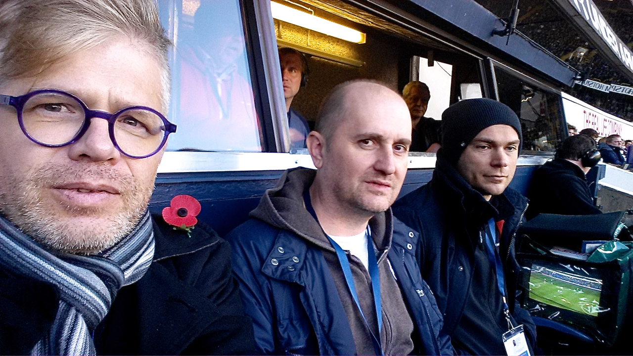 Moj prijatelj in kolega reporter Ian Abrahams, na twitterju @broadcastermoose, sicer navijač West Hama. Na njegovi desni je Tottenhamov piarovec Simon Felstein